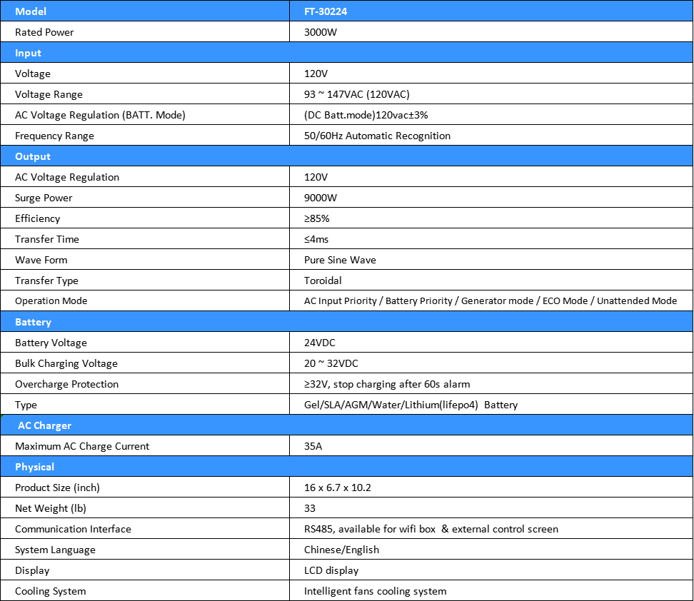 - Five working mode : AC priority mode / Battery priority mode / Generator mode / ECO mode / Unattended mode.