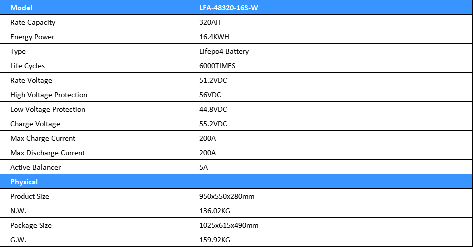 - The 51.2V 320AH LiFePO4 Battery is compact, designed for Wall-mounted, LCD, and cable/accessories ready for installation.