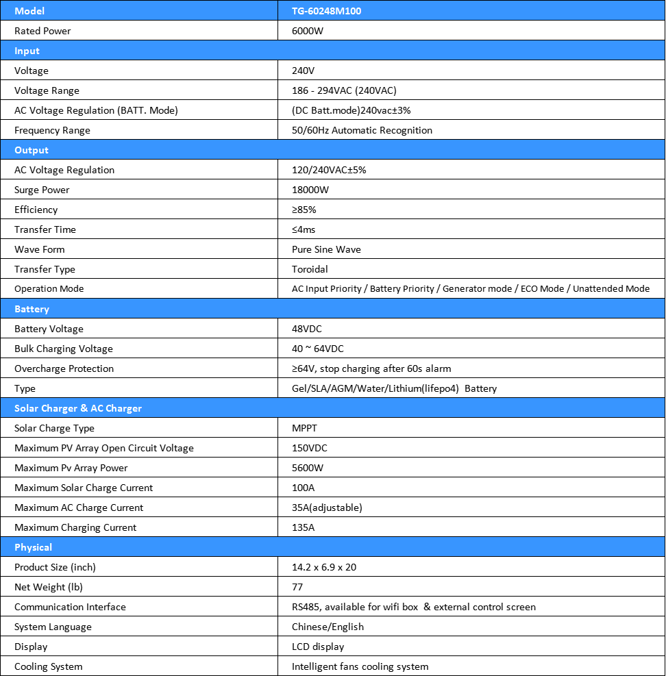 6000W DC 48V Off grid Low frequency Split Phase Solar Inverter Charger