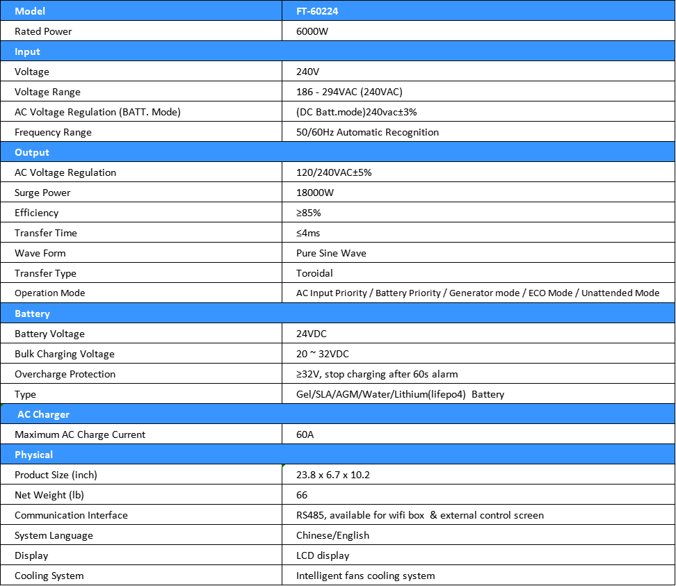 6000W DC 24V Split Phase Pure Sine wave Inverter with AC Charger